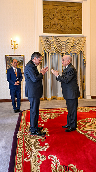 នៅវេលាព្រឹកថ្ងៃទី ៩ ខែ មករា ឆ្នាំ ២០២៦ ព្រះករុណាព្រះបាទសម្តេចព្រះបរមនាថ នរោត្តម សីហមុនី ព្រះមហាក្សត្រនៃព្រះរាជាណាចក្រកម្ពុជា ជាទីគោរពសក្ការ:ដ៏ខ្ពង់ខ្ពស់បំផុត សព្វព្រះរាជហឬទ័យប្រោសព្រះរាជទាន ឯកឧត្តម Buakeo Phumvongsay ឯកអគ្គរដ្ឋទូតវិសាមញ្ញ និងពេញសមត្ថភាពតែងតាំងថ្មី នៃសាធារណរដ្ឋប្រជាធិបតេយ្យប្រជាមានិតឡាវ ប្រចាំព្រះរាជាណាចក្រកម្ពុជា ចូលថ្វាយបង្គំគាល់ដើម្បីថ្វាយបង្គំលាក្នុងឱកាសដែលឯកឧត្តម បានបញ្ចប់បេសកកម្មការទូតប្រកបដោយជោគជ័យ នៅព្រះរាជាណាចក្រកម្ពុជា នៅមហាប្រាសាទខេមរិន្ទ ។