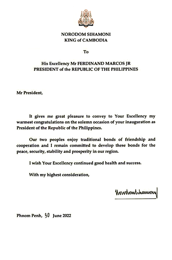 Letter to H.E. Mr FERDINAND MARCOS JR, PRESIDENT of the REPUBLIC OF THE PHILIPPINES.