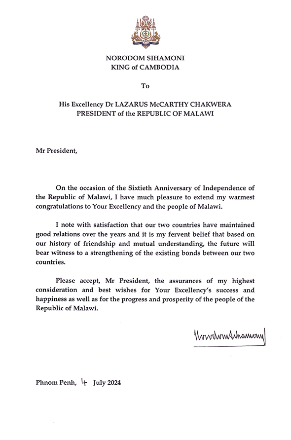 Letter to His Excellency Dr LAZARUS McCARTHY CHAKWERA, PRESIDENT of the REPUBLIC OF MALAWI.