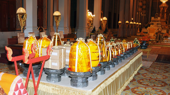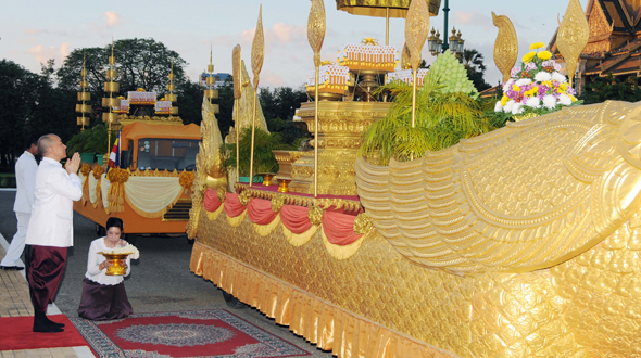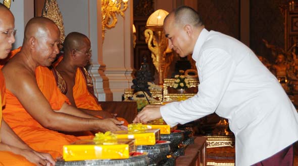 Each year HM the King observes the Kathentean Royal ritual, a Buddhist ceremony consisted in supplying Buddhist monks with offerings. This year HM the King chose Meatikaram Pagoda, in Preah Sedch district, Prey Veng Province as a pagoda to receive the Royal Offerings. On first November 2013 afternoon, 8 monks from Meatikaram Pagoda, performed the Buddhist ritual presided over by HM the King accompanied by Palace dignitaries and Members of the Royal Family. Among the Royal entourage: High Privy Counsellors to HM the King Samdech Norodom Sirivudh and Spouse, Samdech Sisowath Chivan Monirak and Spoue, Samdech Sisowath Pong Neary Monipong, deputy Prime Minister and Minister of the Royal Palace Samdech Chauvea Veang Kong Sam Ol.