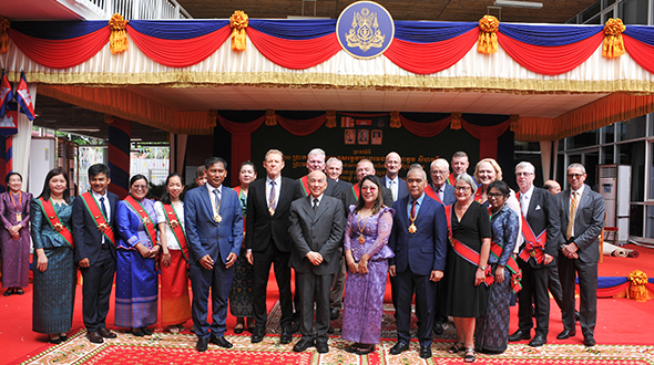 On 28 May 2024, at Neeson Cripps Academy in Meanchey District, Phnom Penh, His Majesty King NORODOM SIHAMONI of Cambodia presided over the ceremony of 20th Anniversary of Cambodian Children’s Fund. His Majesty the King has handed over to Mr Scott Neeson, Founder and CEO of CCF, a donation of five thousand USD, 20 tons of husked rice, 12,000 packets of fine rice noodles, 2,500 cans of sardines, and awarded decorations to CCF staff and donors.