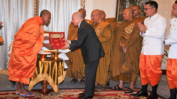 On 29 January 2024, at the Khemarin Pavilion, His Majesty King NORODOM SIHAMONI of Cambodia greeted His Holiness Samdech Bour Kry and his delegation of venerable monks and followers, coming to present their contributions of forty million riels and twenty tons of husked rice for His Majesty the King’s charitable works, and to present five pieces of gold lotus to His Majesty.