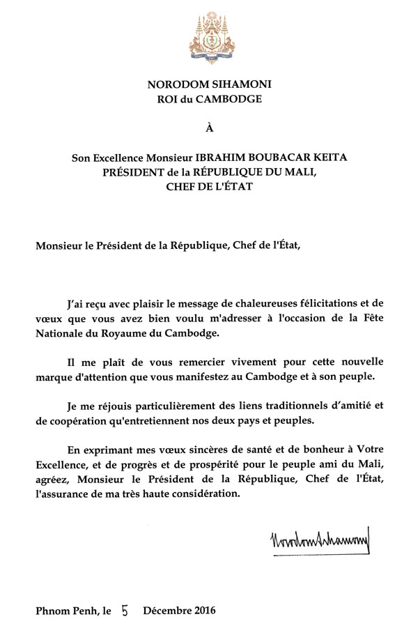 Lettre de Samdech Akka Mohasenapadey Decho Hun Sen, Premier Ministre du Cambodge