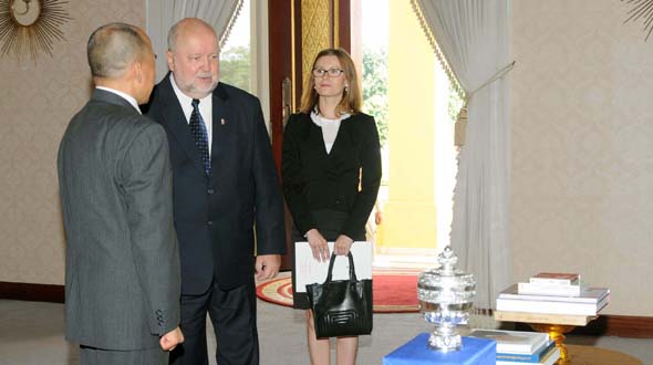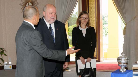 A 11h00 du jeudi 14 novembre 2013, au Palais Khemarin, Sa Majesté le Roi a daigné accorder une audience à SE Docteur Jerzy Bayer, Ambassadeur Extraordinaire et Plénipotentiaire de la République de Pologne, à la fin de sa mission au Royaume du Cambodge.