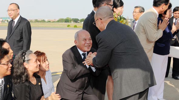 Dans l'après midi du 3 mai 2015, SM le Roi du Cambodge et SM la Reine-Mère arrivent à l'aéroport de Phnom Penh, en provenance de la République Populaire de Chine. Présents à l'aéroport pour accueillir Leur Majestés, Samdech Heng Samrin, Président de l'Assemblée Nationale, Samdech Hun Sen, Premier Ministre du Cambodge, Samdech kittiprittbandit Bun Rany Hun Sen, Présidente de la Croix Rouge Cambodgienne, SE M Say Chhum, Représentant de Samdech Chea Sim Président du Sénat, Samdech Norodom Sirivudh, Haut Conseiller Privé de SM le Roi et son épouse, Samdech Sisowath Chivan Monirak, Haut Conseiller Privé de SM le Roi et son épouse, SE Mme BU JIANGUO, Ambassadeur extraordinaire et Plénipotentiaire de la RPC près le Royaume du Cambodge, les Membres de la Famille Royale et les hautes Personnalités du Royaume.