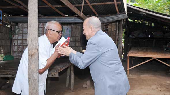 En déplacement dans le district de Srey Santhor, province de Kompong Cham, le 27 décembre 2019, Sa Majesté le Roi NORODOM SIHAMONI du Cambodge a rendu visite aux familles les plus démunies et a distribué à chacun et chacune des 460 chefs de famille paysanne des dons : 50kg de riz, 30 sachets de vermicelle, 10 boîtes de sardines, une moustiquaire, une natte, une paire de chaussures, une ampoule d’éclairage à énergie solaire, une couverture, un sarong, un krama, un T-shirt et cent mille Riels.