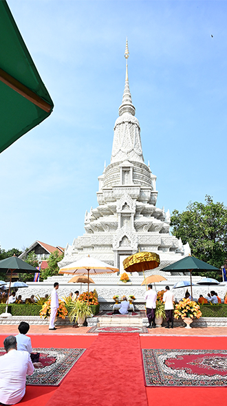 Sa Majesté le Roi NORODOM SIHAMONI du Cambodge a présidé la Cérémonie Bouddhique dédiée à la Mémoire de S.M. la Reine SISOWATH MONIVONG KOSAMAK NEARYRATH SIRIVADANA, le 9 avril 2025 à la Pagode d’Argent.
