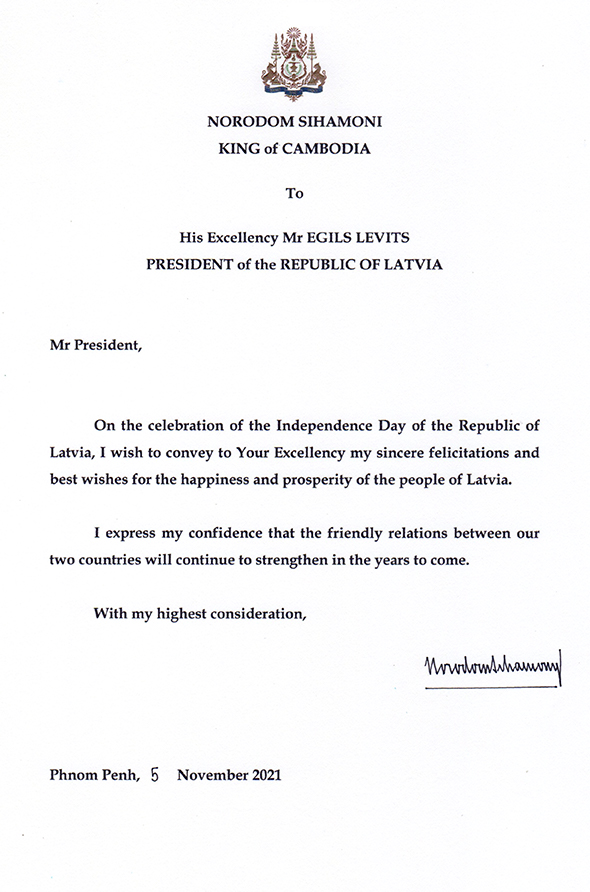 ព្រះរាជសារផ្ញើជូន ឯកឧត្តម EGILS LEVITS ប្រធានាធិបតីនៃសាធារណរដ្ឋឡេតូនី