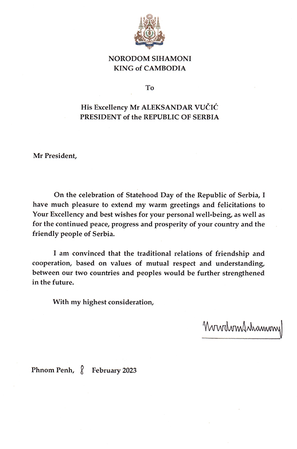 ព្រះរាជសារផ្ញើជូន ឯកឧត្តម ALEKSANDAR VUČIĆ ប្រធានាធិបតីនៃសាធារណរដ្ឋស៊ែប៊ី