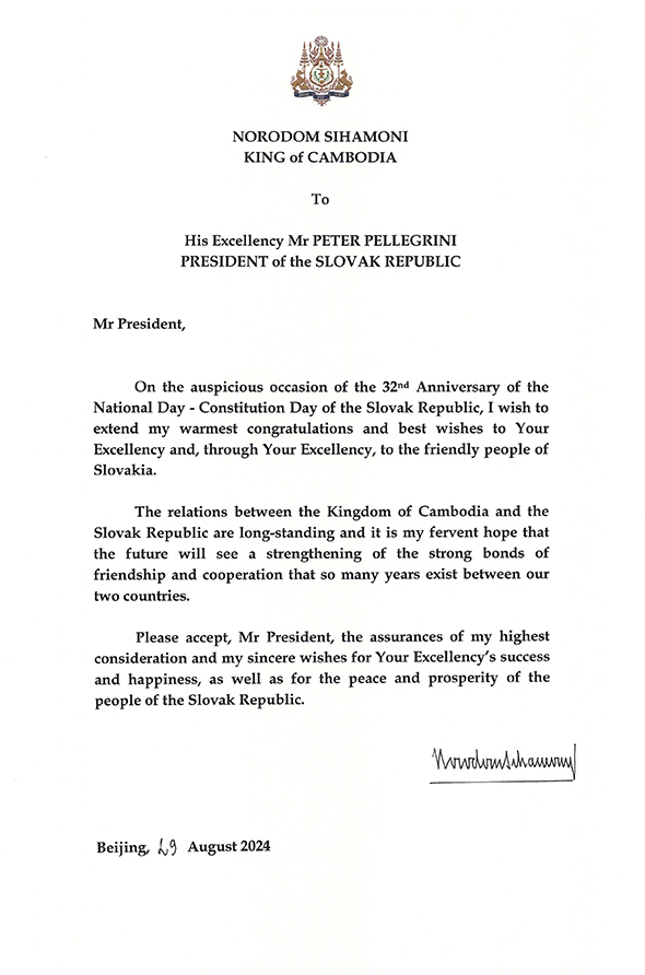 ព្រះរាជសារផ្ញើជូន ឯកឧត្តម PETER PELLEGRINI ប្រធានាធិបតីនៃសាធារណរដ្ឋស្លូវ៉ាគ