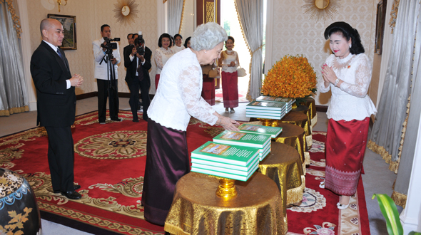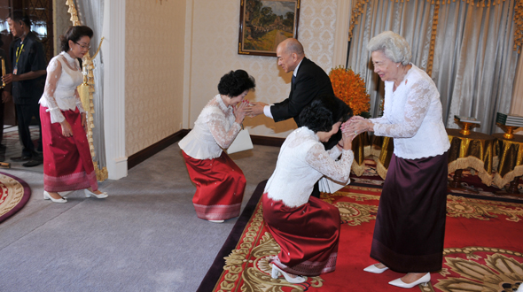 ព្រះវររាជមាតាជាតិខ្មែរ ក្នុងសេរីភាពសេចក្តីថ្លៃថ្នូរ និងសុភមង្គល ជាទីគោរពសក្ការ:ដ៏ខ្ពង់ខ្ពស់បំផុត សព្វព្រះរាជហឬទ័យប្រោសព្រះរាជទាន គណៈប្រតិភូកាកបាទក្រហមកម្ពុជាដឹកនាំដោយ