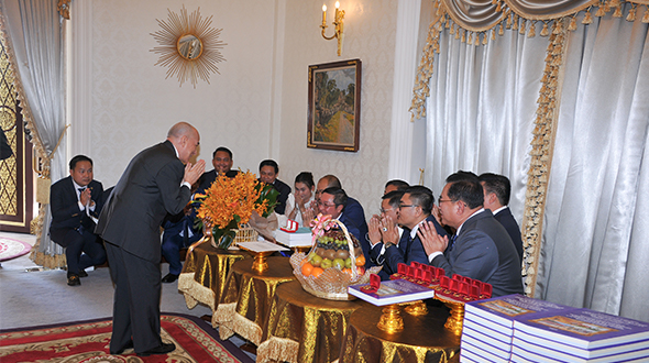 និង គណៈប្រតិភូ ចូលក្រាបថ្វាយបង្គំគាល់ នៅមហាប្រាសាទខេមរិន្ទ នៅថ្ងៃទី ១១ ខែ សីហា ឆ្នាំ ២០២៣ ។